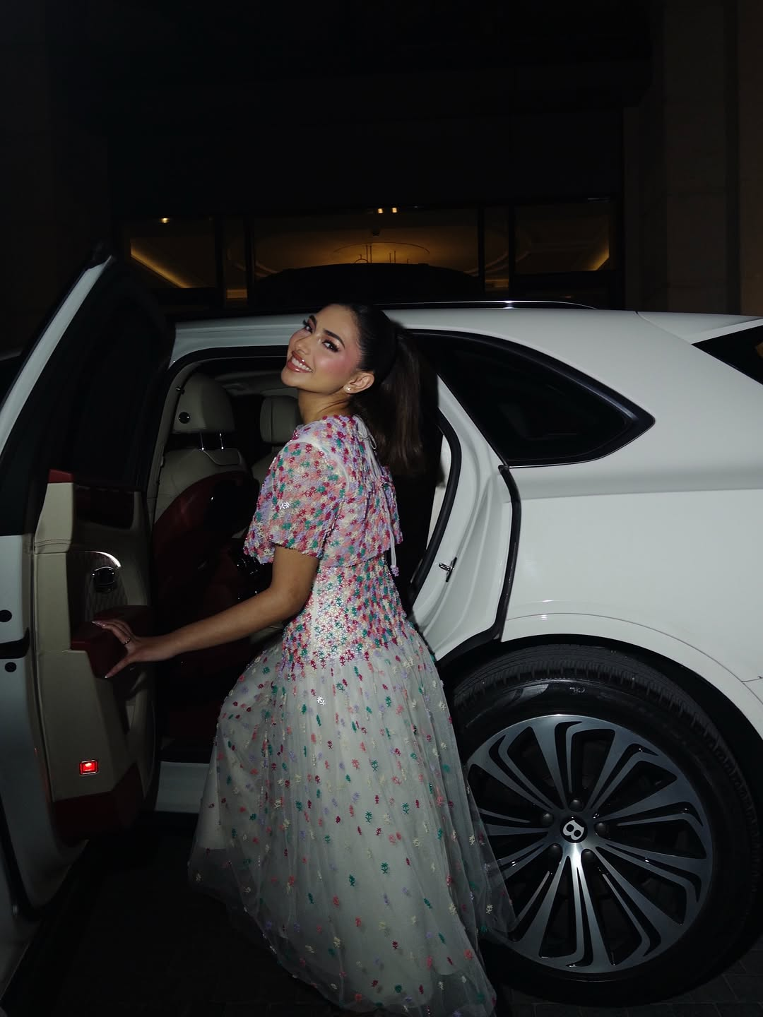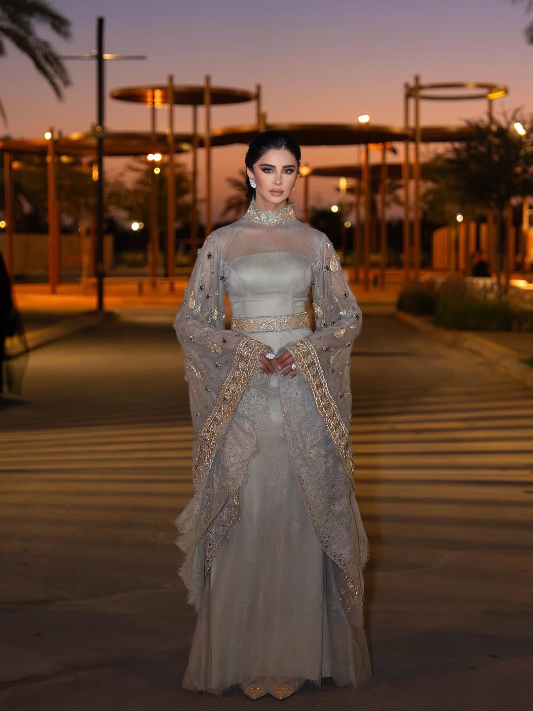 Mona Al Muhaideb wore a pastel, hand-embroidered look by Rahaaf Al Harbi, defined by a straight silhouette, butterfly sleeves, and silver-thread borders that traced neckline and waist like fine calligraphy.