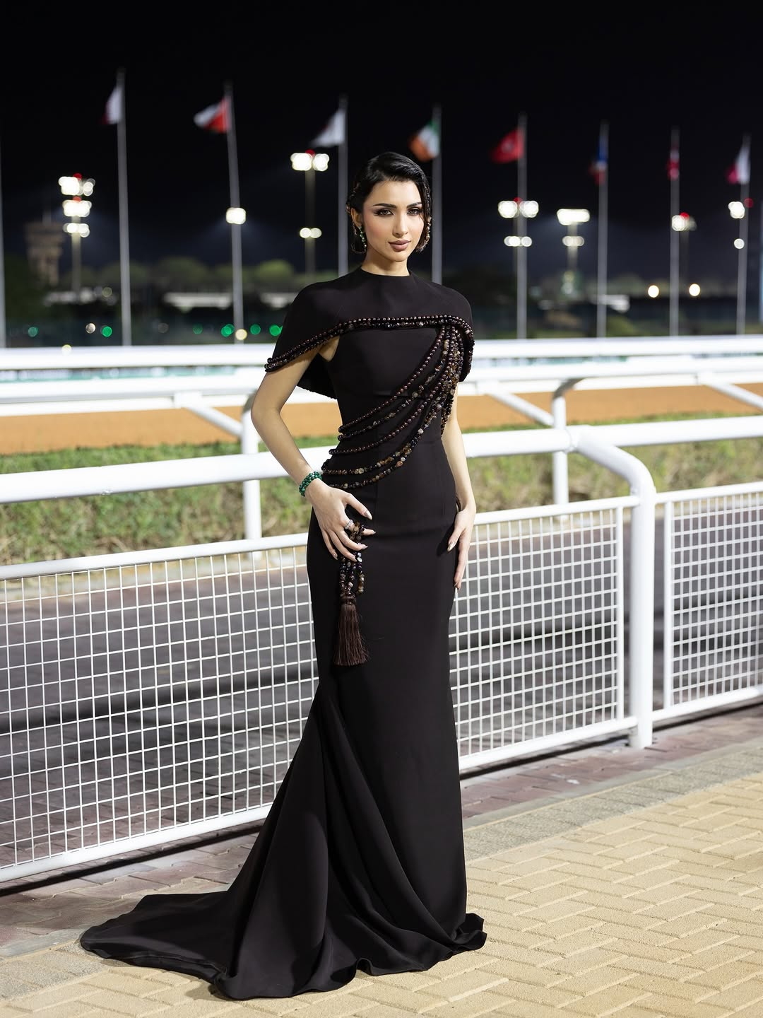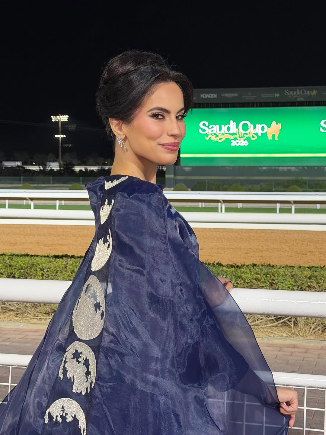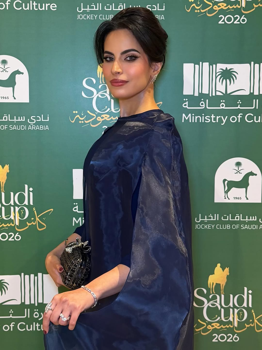 Saudi actress Ida Al-Kusay arrived at the Saudi Cup 2026 in a look by Saudi designer Noumira. Sleek, modern, and softened with a sheer drape that moved like light. The design code was unmistakably celestial: a deep midnight tone paired with a cascade of circular, moon-like motifs, reading like phases in motion. She finished the moment with fine jewelry by Bandar Jewelry, a restrained sparkle that let the silhouette speak first.