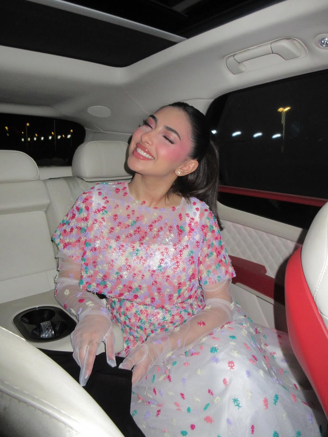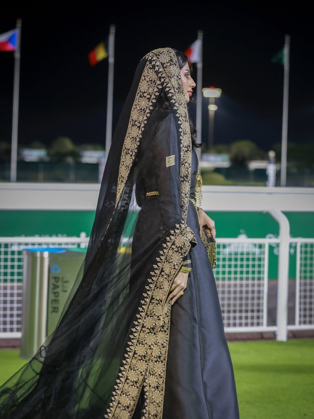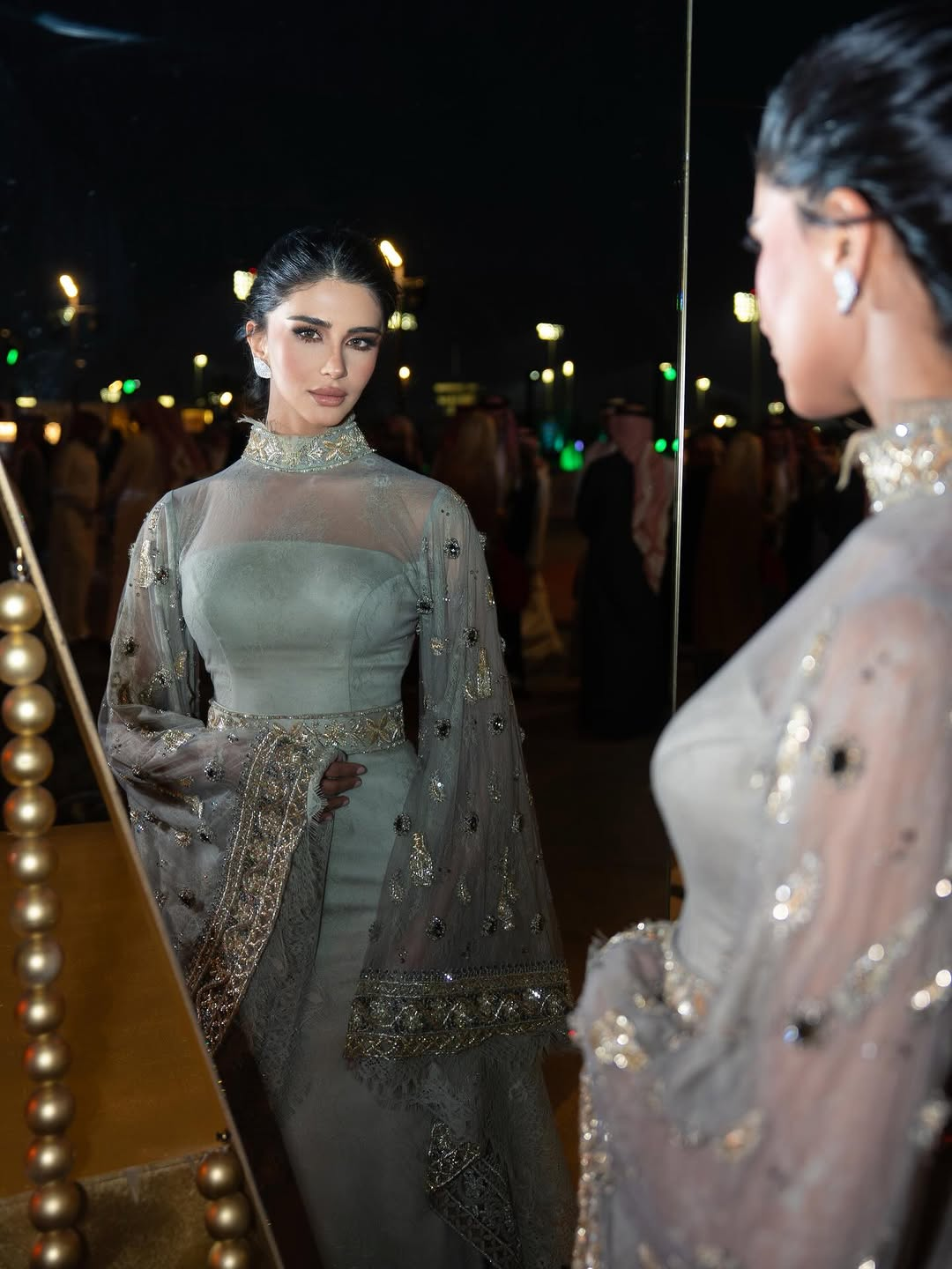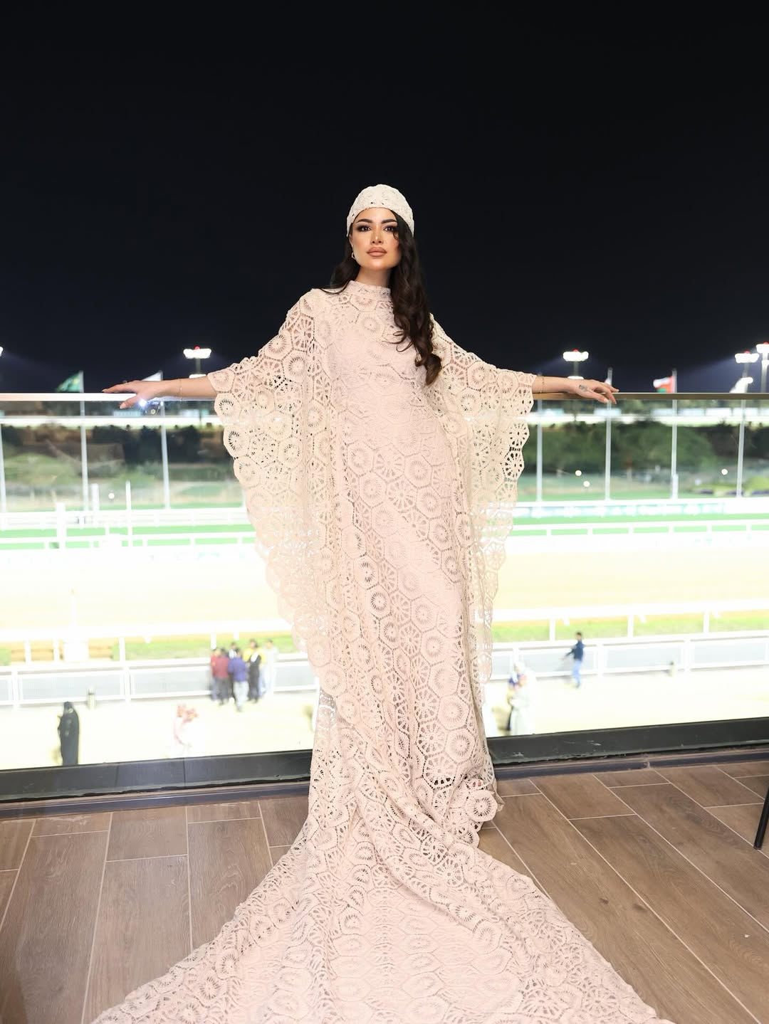 Saudi actress Ida Al-Kusay arrived at the Saudi Cup 2026 in a look by Saudi designer Noumira. Sleek, modern, and softened with a sheer drape that moved like light. The design code was unmistakably celestial: a deep midnight tone paired with a cascade of circular, moon-like motifs, reading like phases in motion. She finished the moment with fine jewelry by Bandar Jewelry, a restrained sparkle that let the silhouette speak first.