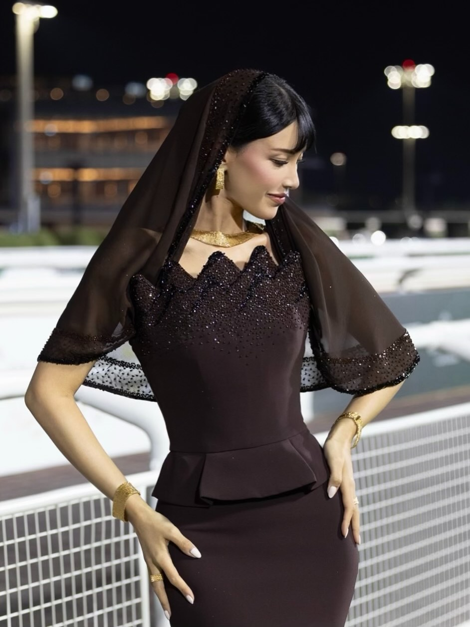 TRès delivered “heritage, but make it architectural.” Zainab Alblushi wore a dark brown design by Ghada Al Shabnat featuring a geometric bodice, tonal sparkle, and a sheer embellished scarf that balanced structure with softness.