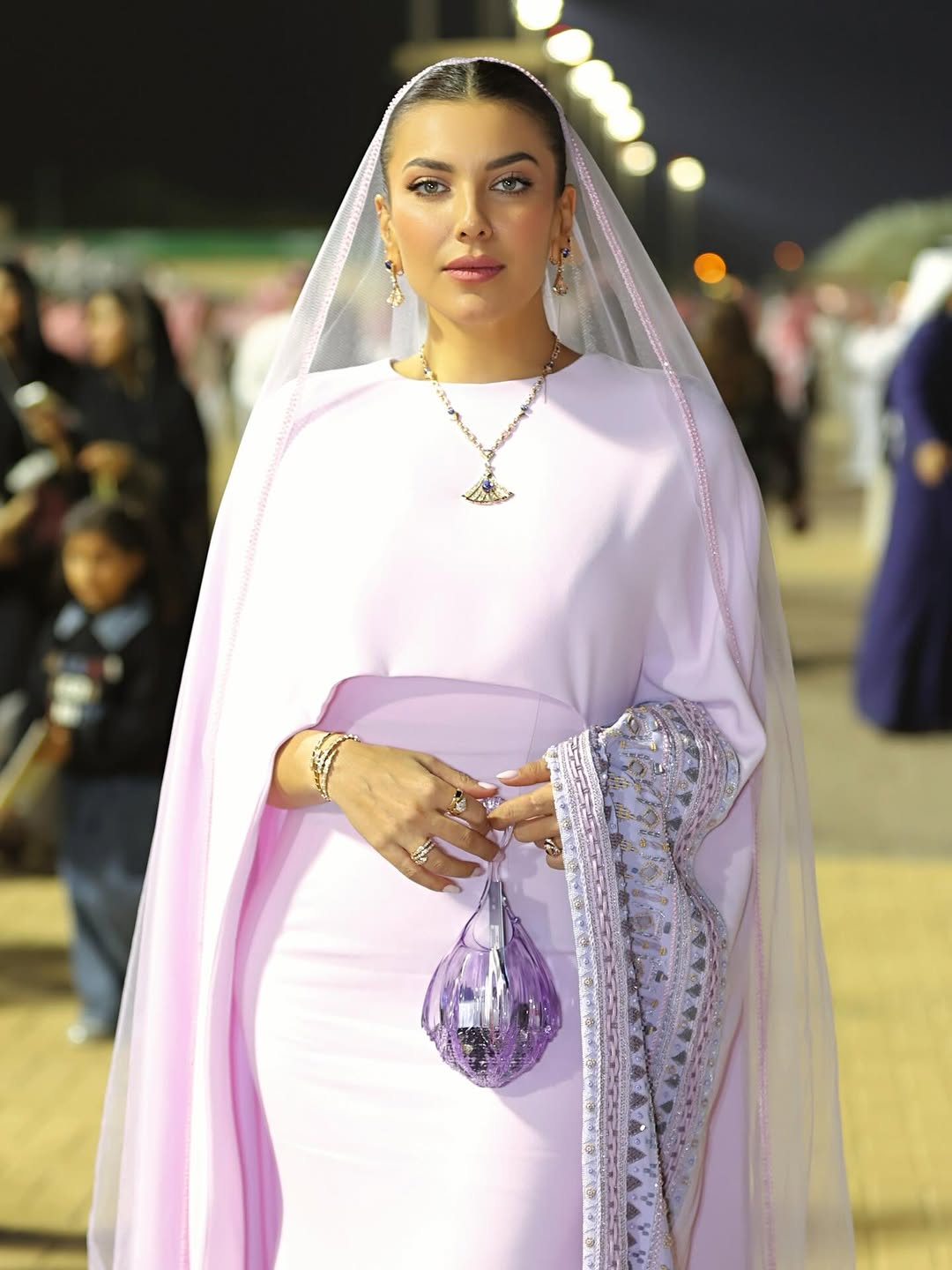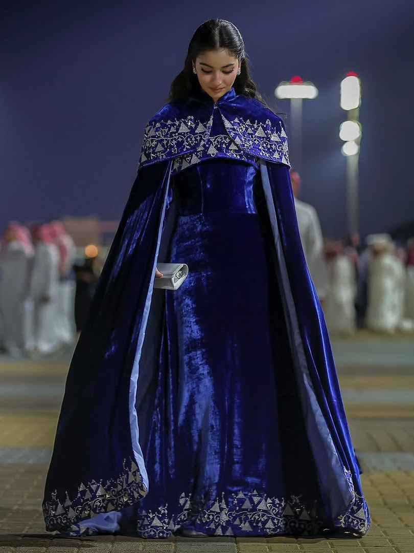 Saudi entrepreneur and fashion influencer Awjan appeared in The Twins Couture with a look channeling the Najdi nashl, detailed with intricate embroidery and finished with a sheer violet shawl that floated like an aura under stadium lights.