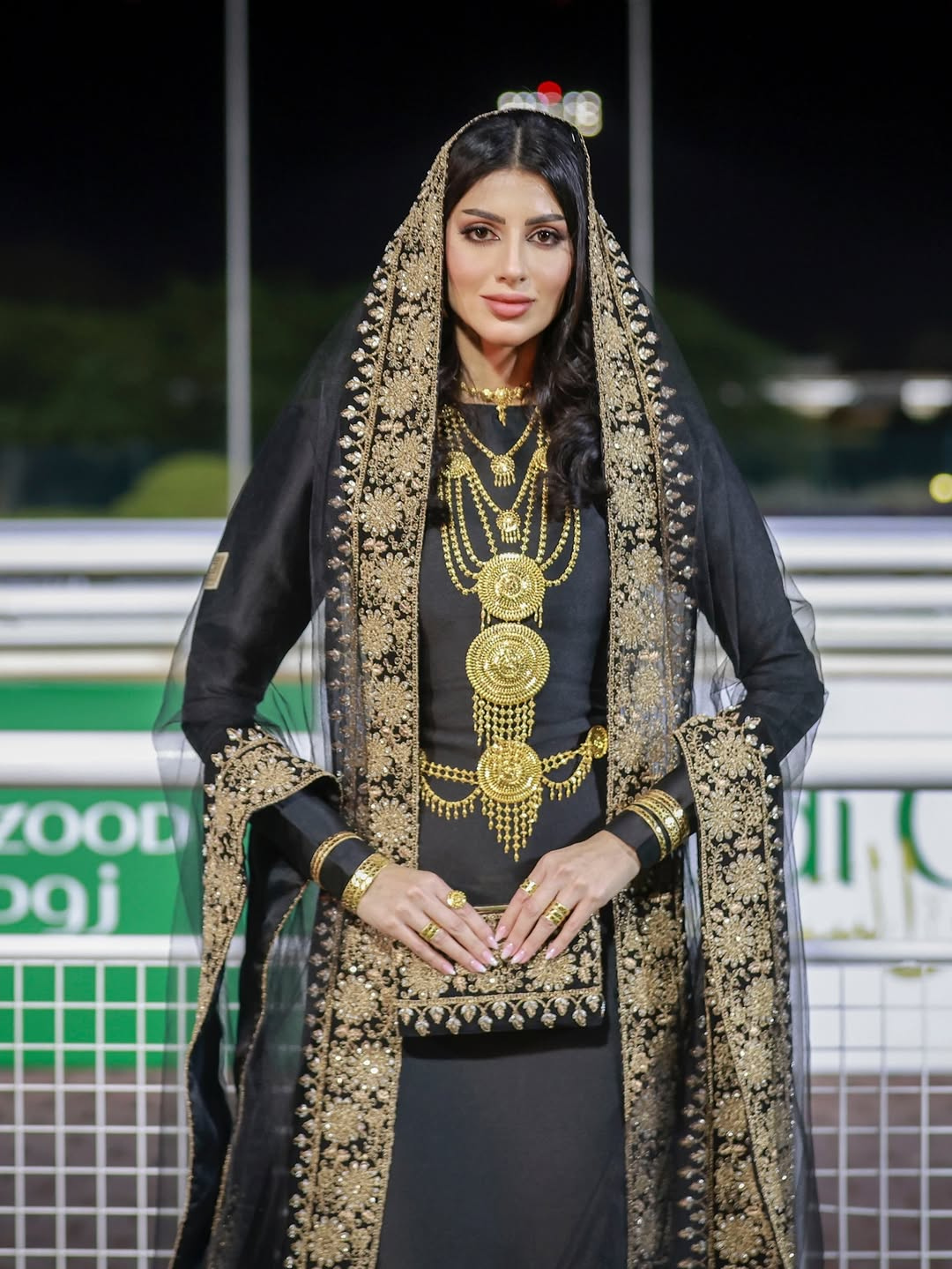 Gold-thread grandeur returned in “Breeq Najd,” worn by fashion and jewelry blogger Raghad Suleiman. Dense gold embroidery referenced Najdi decorative motifs, paired with a tulle element inspired by nashl textiles. Ceremonial black-and-gold done with confidence.