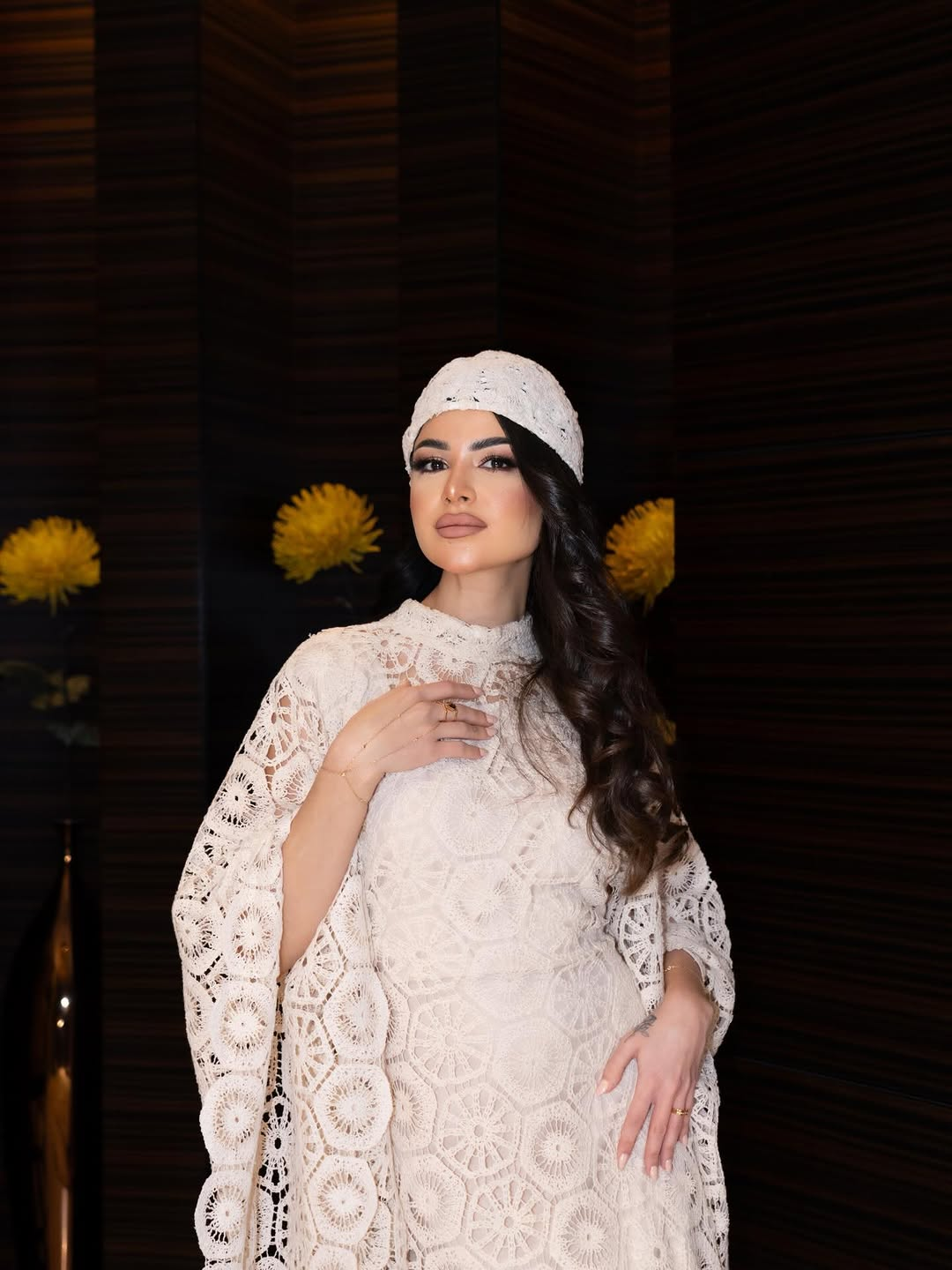 Rawan Al Khalid wore a pastel, hand-crocheted look by Salwa Al Kurdi inspired by the men’s cap (المشخل), transforming a familiar everyday object into an elongated, dramatic couture statement.