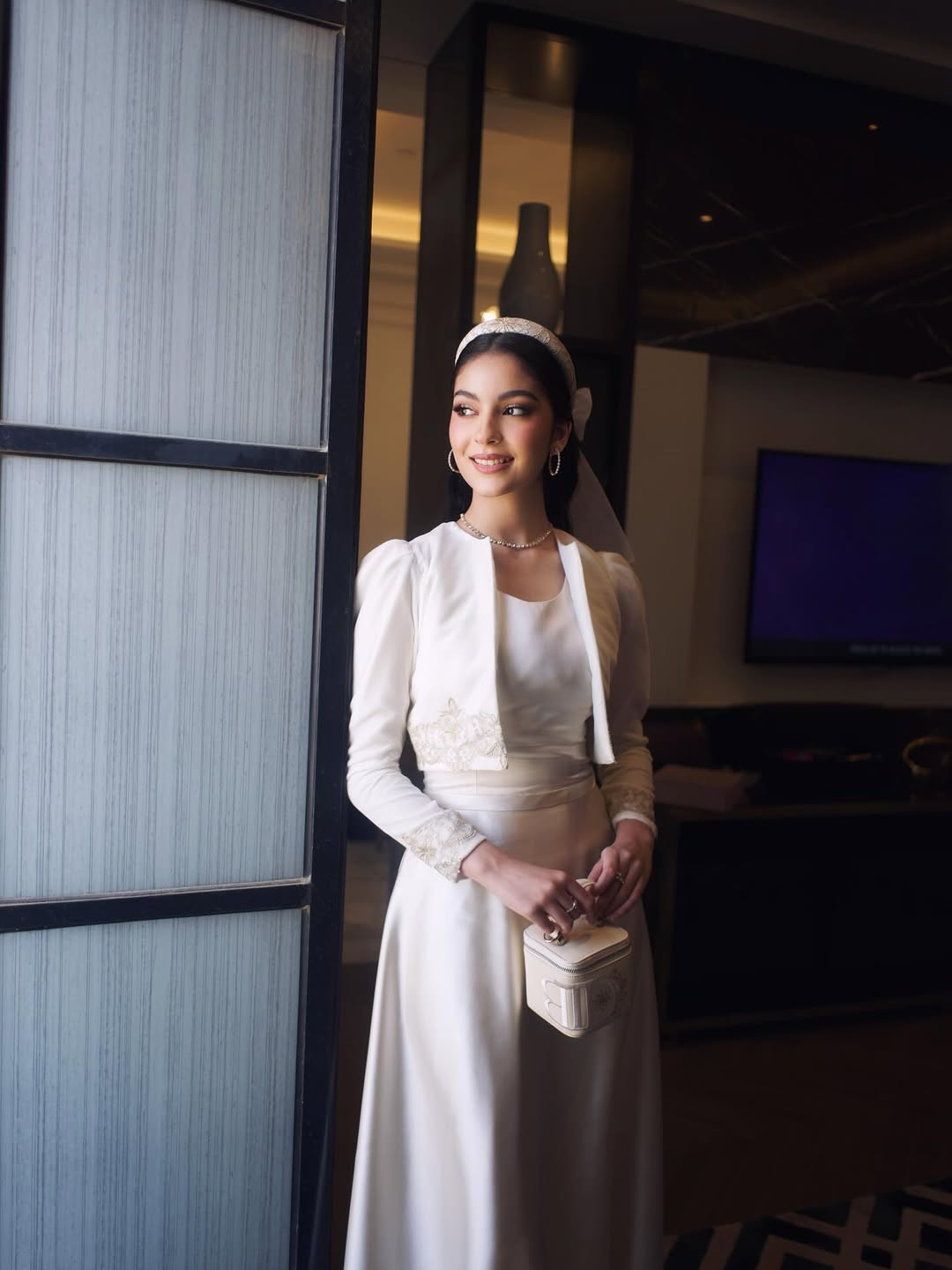 Saudi fashion influencer Monia Al-Sanie chose symbolism with impact, stepping out in a look "Palm of Glory", designed by IKH Fashion. A sculpted ivory gown with soft puff sleeves, crowned by lavish gold-and-emerald palm embroidery cascading from the bodice like a living emblem. She finished the “Palm of Glory” moment with a sheer dotted veil and a metallic clutch. Bridal elegance, Saudi symbolism, and modern polish in one look.