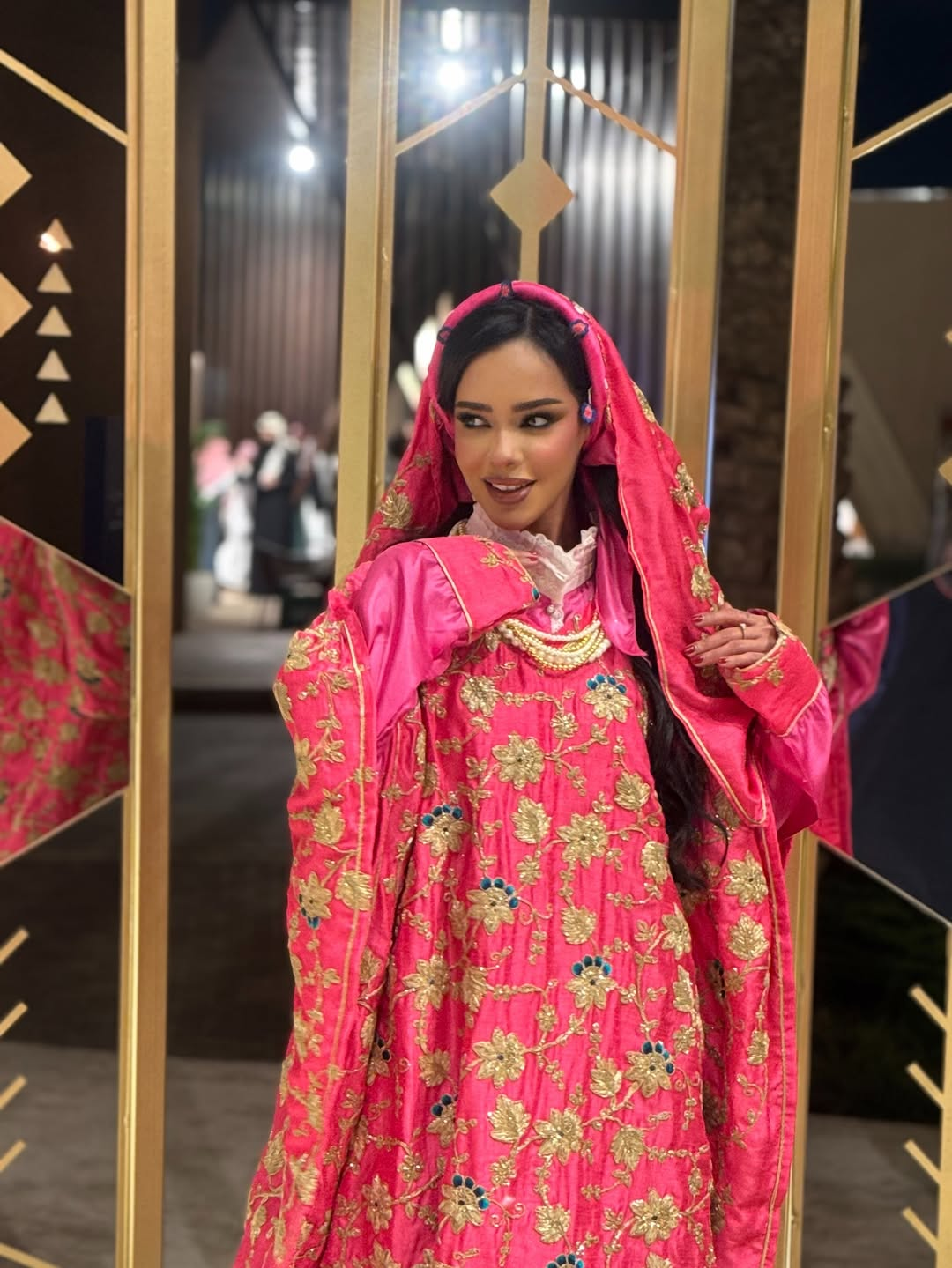 Saudi actress Ruha Fahad turned the stands into a living archive wearing a traditional Medina bridal look in vivid fuchsia, lavish with gold embroidery, signed by Boutique Ghada. A traditional head covering embellished with sequins and pearls completed the story.