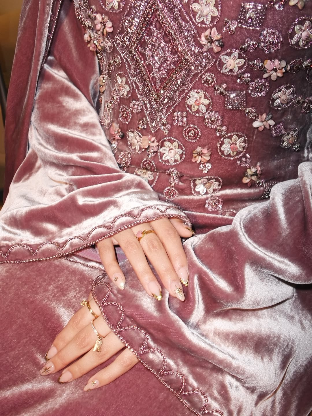 The Twins made velvet feel made for the racecourse. Saudi style figure and creator Dana Tamim wore a silk-velvet lavender dress embroidered with shimmering florals, paired with a handworked veil reportedly inspired by the Najdi mukhannaq adorned with natural stones.