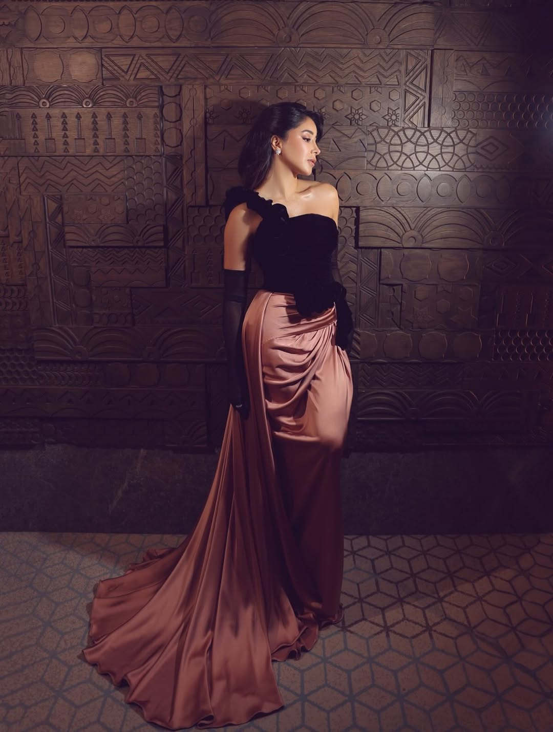 Black and sculptural, the strapless gown paired a clean, velvet-finish bodice with a dramatic satin mermaid skirt, shaped through structured paneling and held volume. Finished with diamond jewelry and a crystal-brooch clutch. Minimal embellishment, maximum impact.