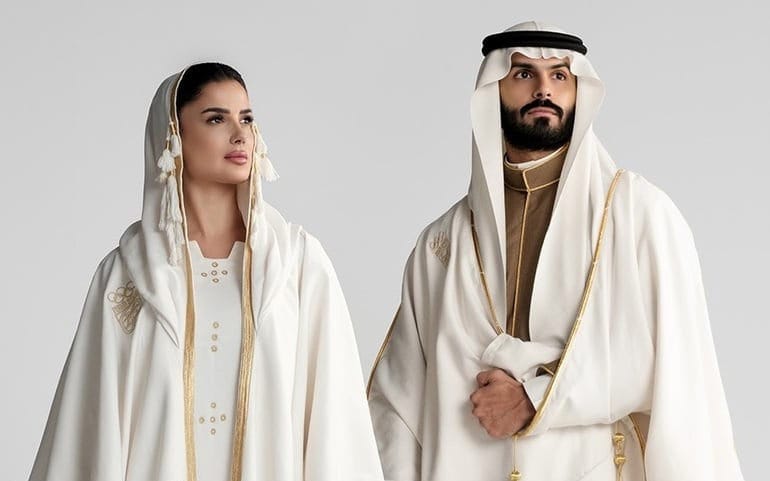 For the women’s look, she drew inspiration from the traditional “Al-Musaddah” (also known as the masdah) dress. Reintroduced through a contemporary cut with handcrafted detailing, the design honored Saudi craftsmanship while speaking fluently to a modern audience.