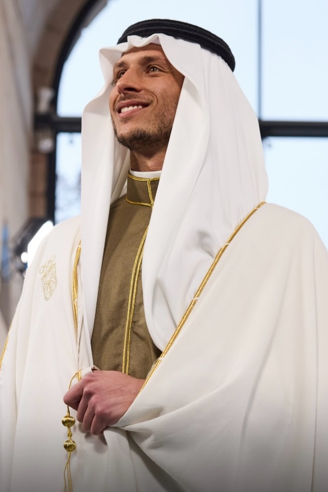 Alya Alsalmi was entrusted with designing a bespoke ensemble for Team Saudi, blending traditional Saudi tailoring with modern athletic symbolism. The look, worn by skier Rakan Alireza, featured a classic Saudi silhouette elevated with refined construction and emblazoned with the Team Saudi and Olympic insignia, bridging heritage and high performance.
