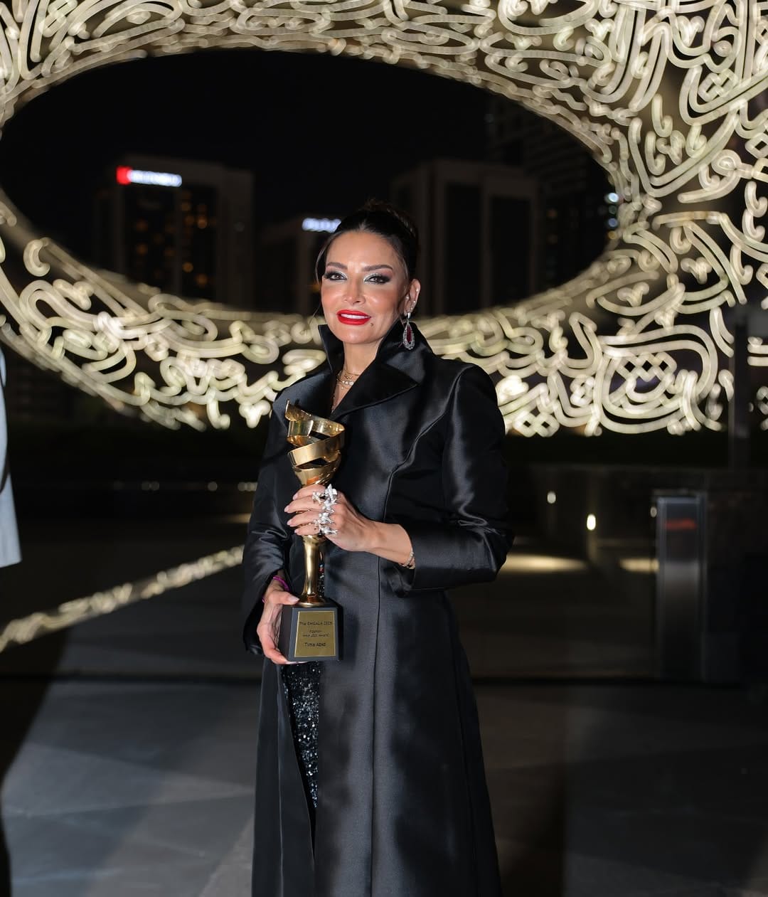 Tima Abid accepts the Fashion Innovator Award at the 2025 EMIGALA in Dubai.
