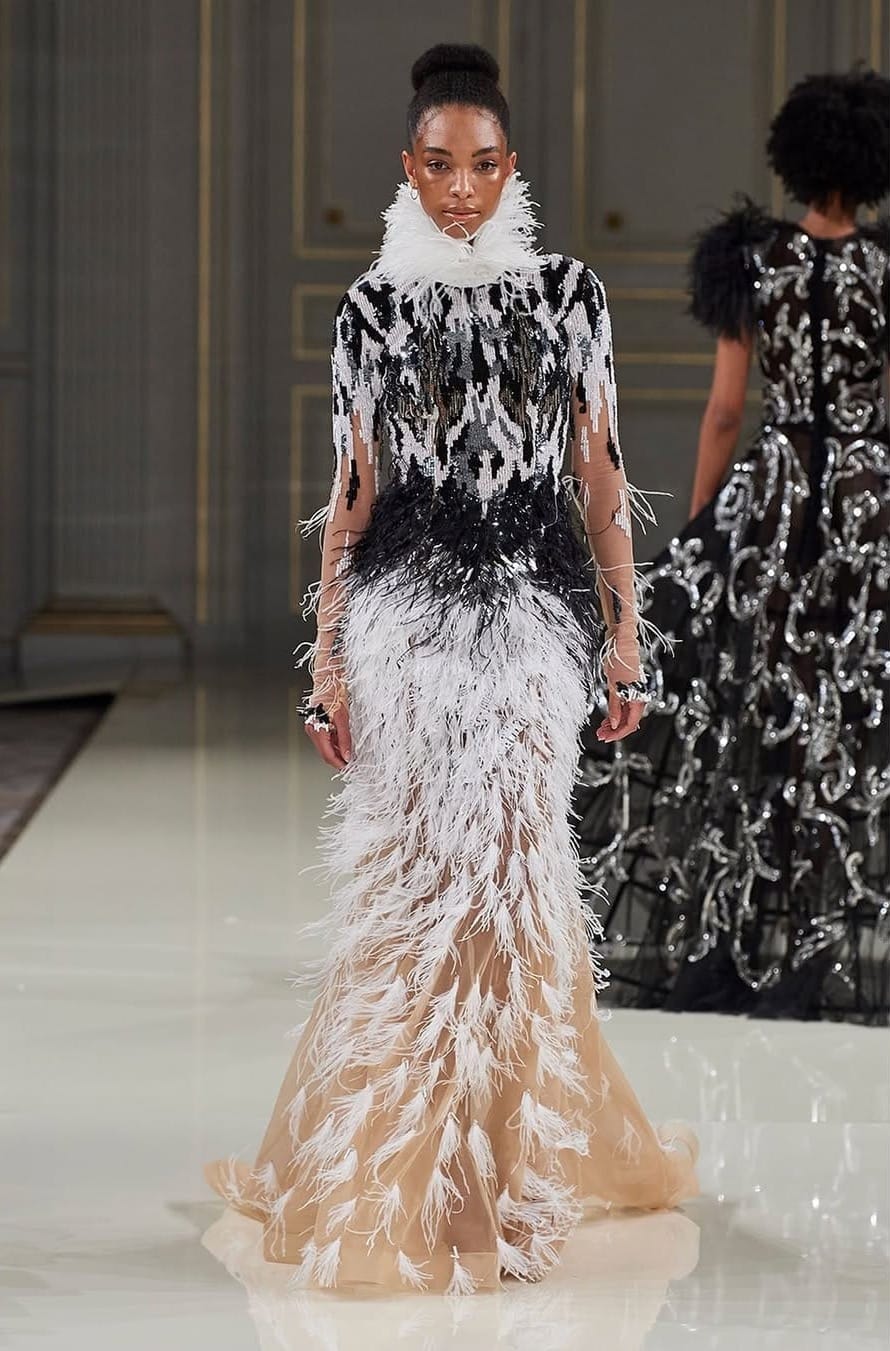 Paris debut looks from Tima Abid’s couture show, featuring feathered ombré gowns, sculpted metallic folds, and refined black elegance.