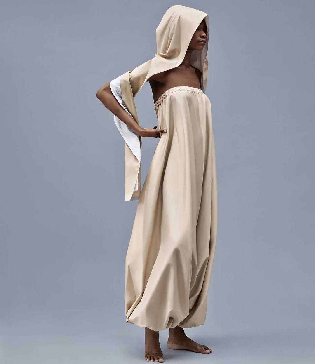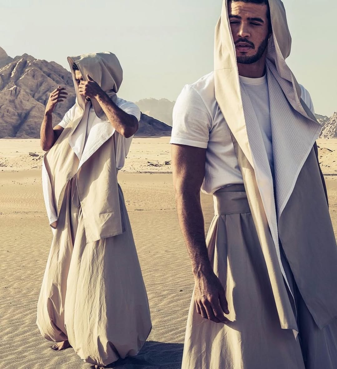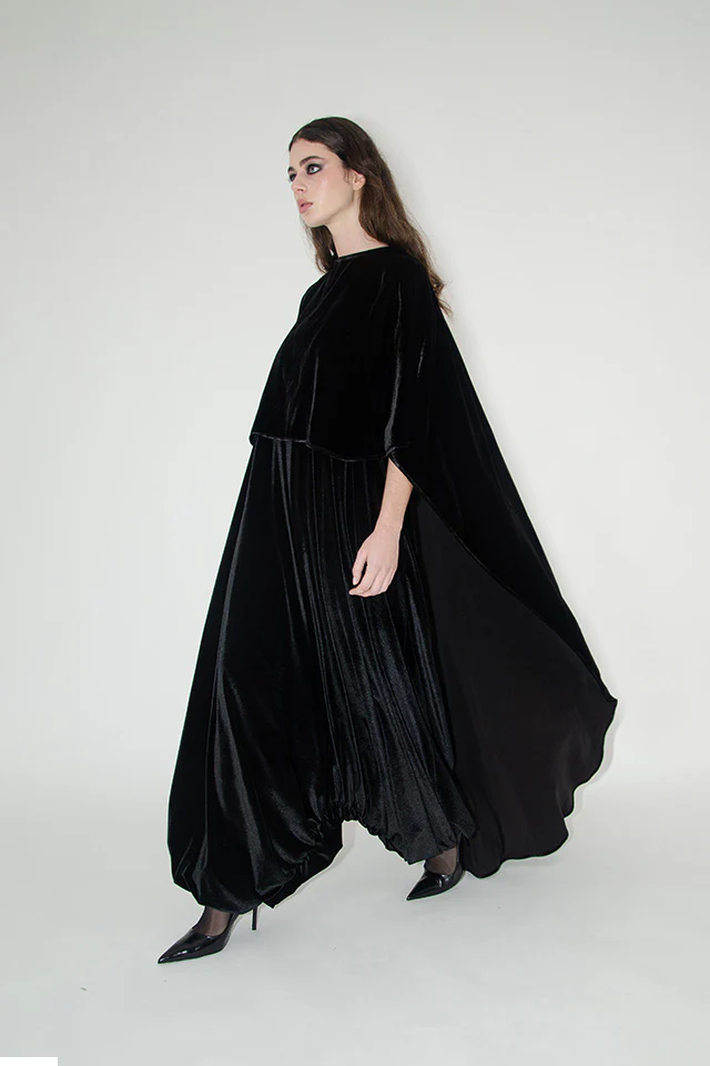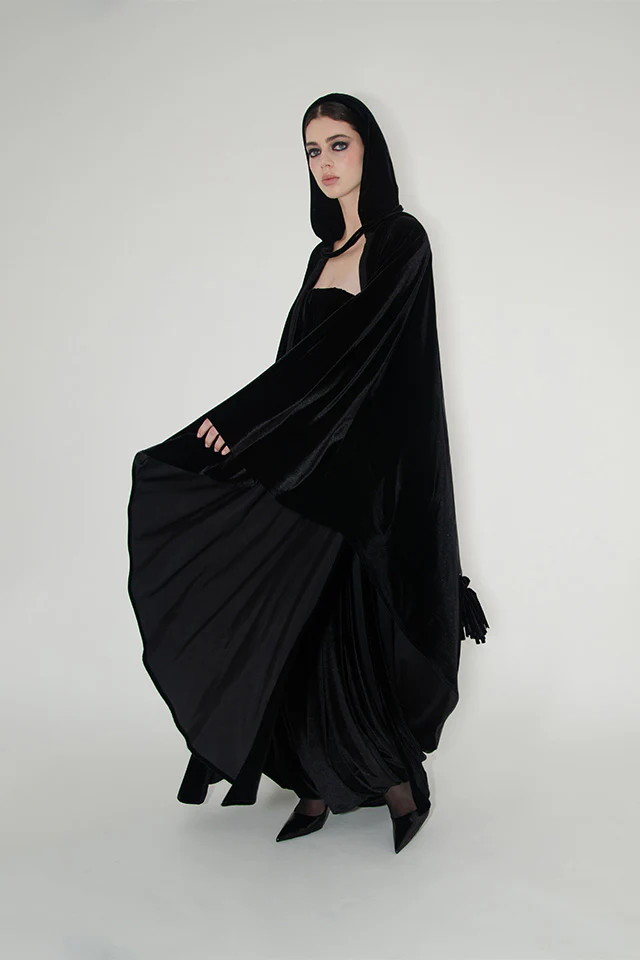 AlKanhal’s design language is a precise conversation between structure and ease. Coats are architected but weightless. Capes move like water. Tunics and trousers echo the respectful volume of regional dress without literal citation.